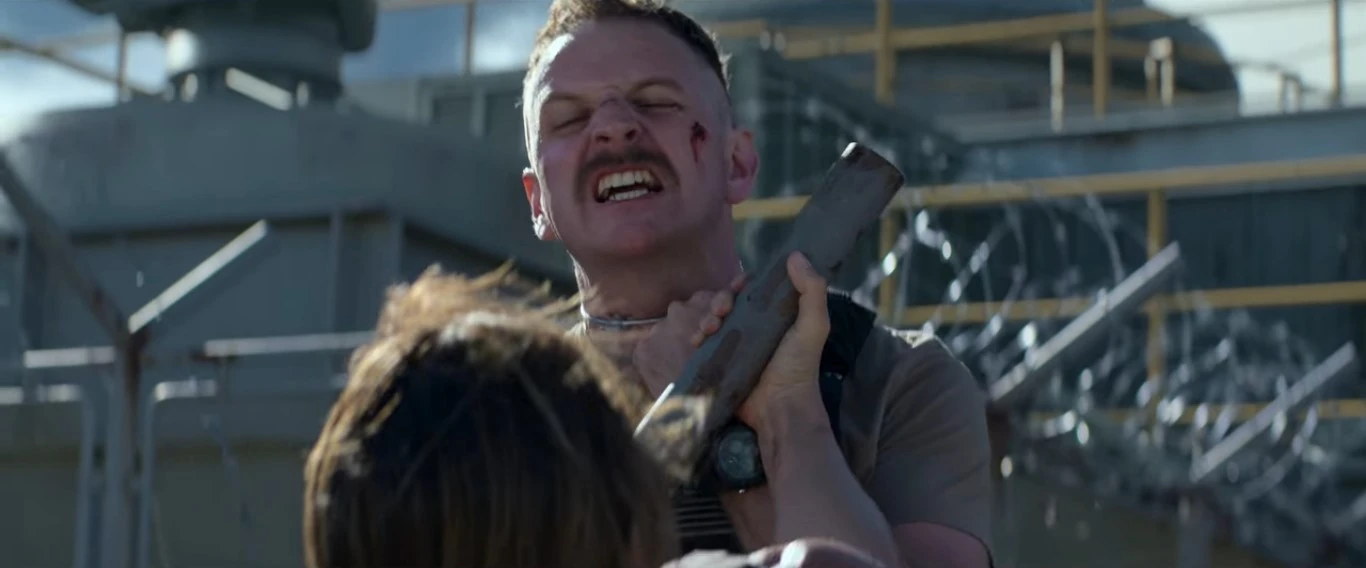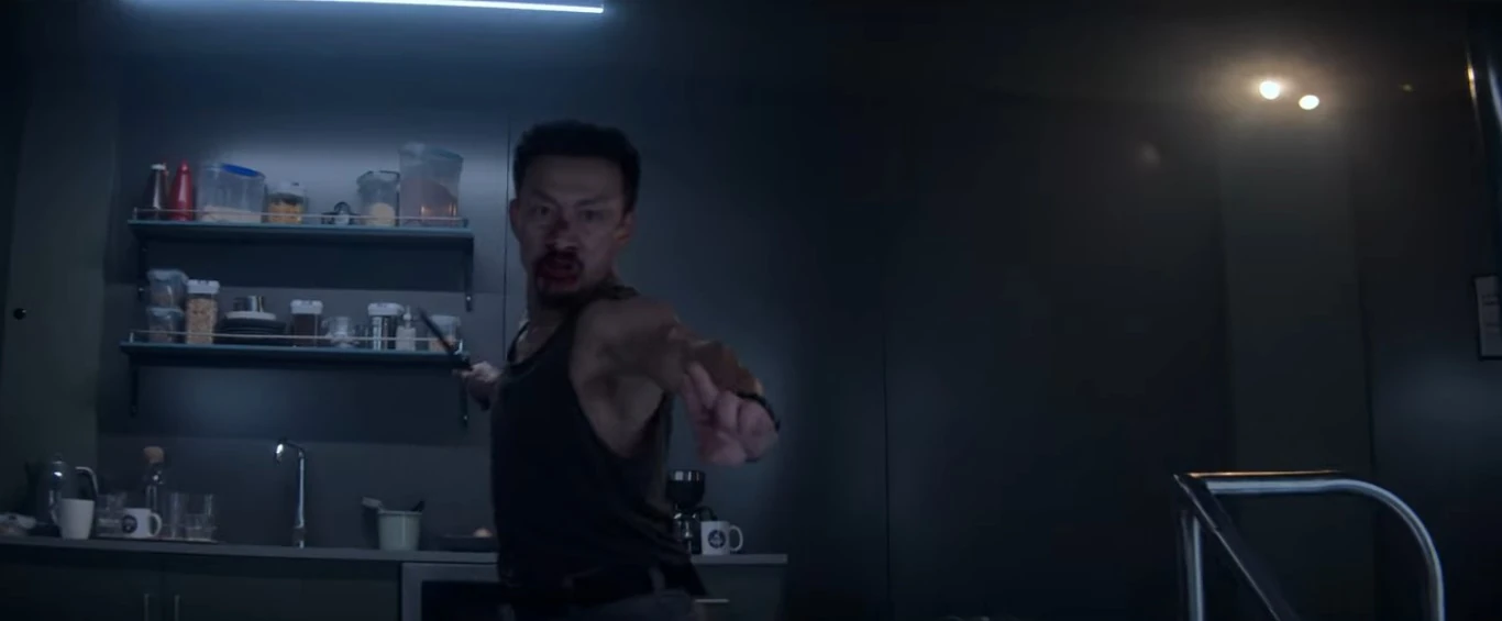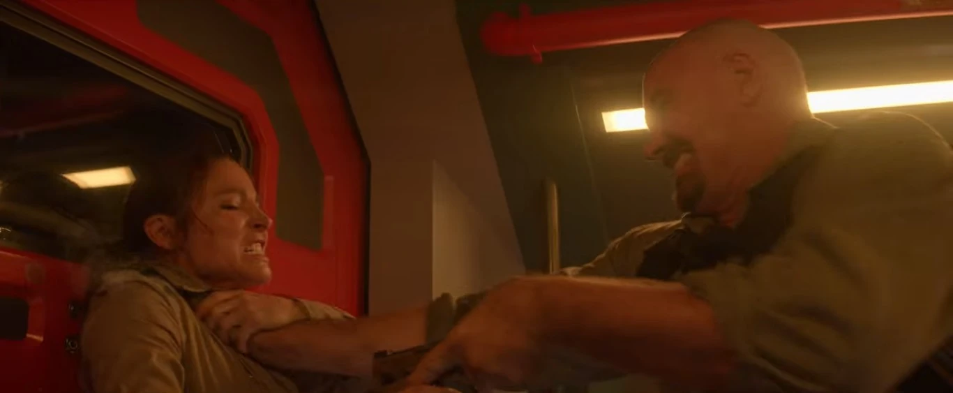 Meanwhile, Zhang made his way to the lower external hatch of the command center via the rungs around the bottom of the platform, and once there blasted it open, catching Collins and Shah off-guard as he breached the command center. Before he could shoot Shah, Zhang was tackled aside by Collins, and after the two fought hand-to-hand, Zhang was killed by a shotgun-wielding Collins.